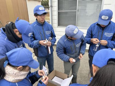 生徒たちはまず投薬の開封準備から行い、猪木先生のお手本を見た後、馬房に行き投薬を開始